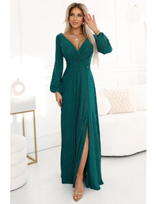 NUMOCO 572-4 NELA shiny long dress with neckline, long sleeves and leg slit - green
