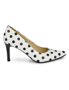 SUPERLATIVE Pantofi dama din piele naturala alba cu buline negre cu toc subtire 7.5 cm 18163